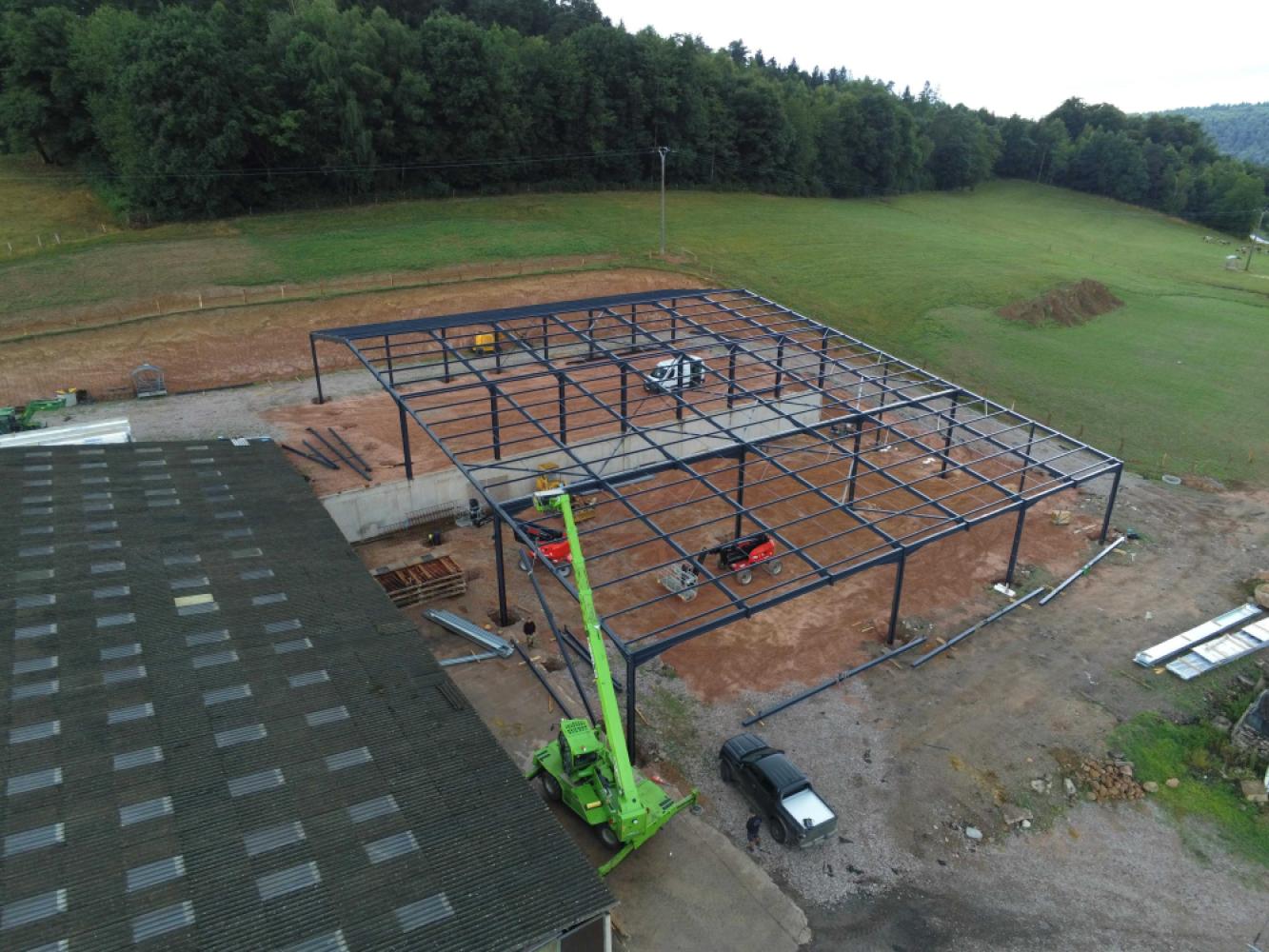 Ce bâtiment a pour dimensions 46m de large par 36m de long, il inclut une parti stockage avec 2 files de porteuses de 10 et 16m, ainsi qu'une partie élevage. Sur ce dossier à la demande du client nous avons réaliser la fabrication et la pose seule de la charpente.